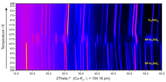 Temperature-dependent X-ray powder diffractogram displaying the back-transformation of HP-Sc2TeO6 to the ambient pressure modification NP-Sc2TeO6.
