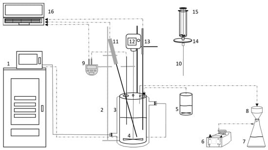 Scheme of the experimental setup. 1 Temperature control system; 2 Universal stand; 3 250mL-Jacketed glass crystallizer; 4 Glass impeller; 5 Reservoir for saturated solution of KCl; 6 Vacuum pump; 7 Buchner flask; 8 Buchner funnel; 9 Pt-100 sensor; 10 Syringe needle; 11 FBRM probe; 12 Overhead stirrer; 13 ATR-FTIR probe; 14 Disposable syringe filter; 15 Syringe; 16 Data acquisition system.