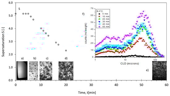 Supersaturation S, crystal/solution images and CLD for a reaction isotherm of 5 °C as a function of time at (a) 1.44 min, (b) 5 min, (c) 10 min, (d) 20 min, (e) 60 min and (f) CLD.