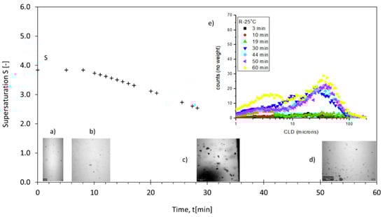 At a reactive crystallization temperature of 25 °C, an initial supersaturation of S0 = 3.84 is generated (Figure 3), which remains constant for ~10 min and then decreases slowly, reaching the final S of 2.53 at 30 min. This implies that the supersaturation was consumed in 20 min and the crystallization process was stopped. Figure 3a,b show the presence of very tiny crystals with a crystal count <2.5 crystals/s in the chord length range of 10–40 microns (Figure 3e). After 30 min (Figure 3c), it is impossible to identify the crystals’ morphology due to their tiny sizes, with a crystal count of 20 crystals/s in a chord length range of 20–30 microns and 15 crystals/s with the size of 9–10 microns. After 60 min (Figure 3d), many tiny crystals are observed with a crystal count of 30 crystals/s between 30–40 microns size and 18.5 crystals/s between 3–6 microns size. Thus, again a bimodal CLD was developed as a result of the generation of fine particles from secondary nucleation mechanisms.