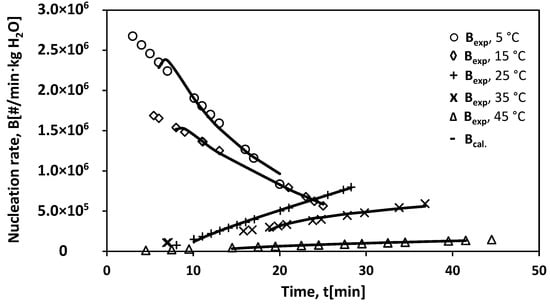 Trifkovic et al. [] used the total number of crystals in the entire FBRM size range (1 to 1000 microns) to calculate the nucleation rate. The number of particles as a function of time is given by Equation (6).