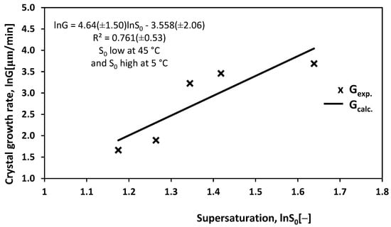 As mentioned above, the dependence of the secondary nucleation rate constant KR on the absolute temperature enables estimating the secondary nucleation activation energy E via the Arrhenius Equation (20). The results for the reactive crystallization process studied are presented in Figure 10, specifying the secondary nucleation activation energy as E = 69.83 kJ∙mol−1. However, to obtain E, the KR values were considered as a function of the temperature that best fit. In addition, the Excel solver has been used under the restrictions of j ≥ 1 for the isotherms of 5, 15, and 25 °C, also to i ≥ 1.5 and 0.12 for the isotherms of 35 and 45 °C, respectively, which improves the determination coefficient (R2 = 0.92) in the activation energy estimation. As seen in Figure 10, the secondary nucleation activation energy is higher in the 5–25 °C segment due to the higher S0 promoting secondary nucleation, while S0 is lower in the 25–45 °C range with the consequence of a lower E.