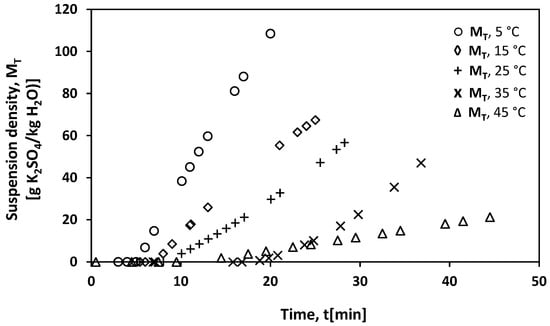 In Figure 9, the absolute suspension densities at different reactive crystallization isotherms are shown as a function of time. At 5 °C (S0 = 5.15), the suspension density increased linearly from 6.84 g of K2SO4/kg H2O at 6 min to 108.45 g of K2SO4/kg H2O at the end of the reactive crystallization at 20 min. At 25 °C (S0 = 3.84), an increase in MT from 3.95 g of K2SO4/kg H2O at 10 min to 56.68 g of K2SO4/kg H2O at the end of the reactive crystallization at 30 min is obtained. Thus, the higher S0, the higher the suspension density reached in less time. The final MT for the isotherms at 15, 35 and 45 °C, with the respective S0 of 4.13, 3.54 and 3.24, were 67.41, 47.03 and 21.29 g of K2SO4/kg H2O, respectively.