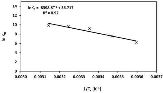 The graphical relationship of versus 1/T is linear, with the slope equals (−Ea/R) and the intercept . Thus, the activation energy Ea can be obtained from the slope of this plot. For reactive crystallization, the dependence of the secondary nucleation rate constant KR on the absolute temperature allows estimating the secondary nucleation activation energy (E) in [kJ/mol] [].