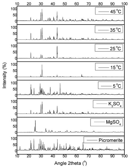 The crystals of K2SO4 obtained as a final product in the reactive crystallization experiments were subjected to X-ray diffraction analysis to be compared with the reagents K2SO4, KCl, and MgSO4 and synthesized picromerite. The diffractograms are compiled in Figure 11. In addition, the product crystals were analyzed regarding the presence of Magnesium as an impurity by ion chromatography. As a result, only very small contents of 0.51, 0.11, and 0.01 wt% of Magnesium were detected in the products of reaction temperatures 5, 15, and 25, 35, and 45 °C, respectively. The X-ray patterns in Figure 11 and the low residual Mg amounts in the crystals prove that the K2SO4 obtained is of high quality. The diffractogram obtained for the K2SO4 product at 5 °C exhibits several intense peaks that correspond to the patterns of K2SO4 and picromerite, verifying the somewhat higher Mg content in the respective product. K2SO4 is the majority phase, and no other crystalline phase is present, considering a detection limit of XRPD <1%. The presence of picromerite peaks might be attributed to mother liquor occluded between the K2SO4 crystals which, after filtration, crystallizes as picromerite when drying. In this work, the washing process of the K2SO4 product was omitted. Of course, when including washing after solid–liquid separation, a further increase of purity is possible but at the expense of yield. The washing process is essential to improve the quality of K2SO4, as accomplished in the crystallization process of K2SO4 from the KCl(s) picromerite(s)-H2O system reported by Fezei et al. [,, ,].