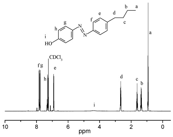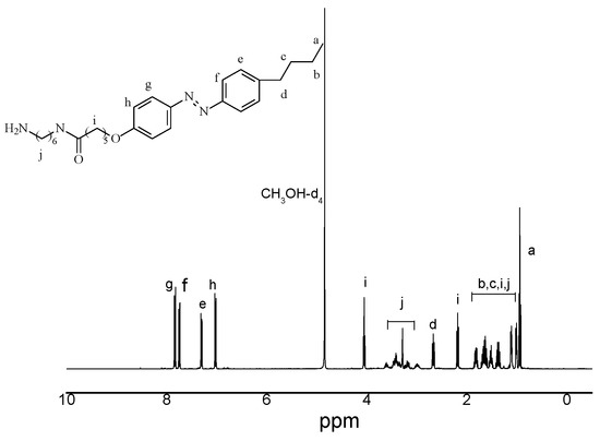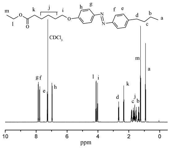 1H NMR spectrums of compound 1 to compound 3 are shown in Figure 1, Figure 2 and Figure 3. The corresponding integral value is marked in Figures S1–S3. The chemical structures of compounds 1, compound 2 and C4-Azo-C5-HDA were also confirmed by the FTIR results. As shown in Figure S4, the absorption occurs at 1600 cm−1 corresponding to the benzene skeleton vibration in the spectrum of azobenzene (compounds 1). The absorption occurs at 1730 cm−1, which is attributed to the carbonyl group of the compounds (compounds 2). The FTIR bands at 1550 cm−1 represent the absorption spectra of amide group (C4-Azo-C5-HDA). The presence of the above bands in the compounds gives strong evidence of successful synthesis.