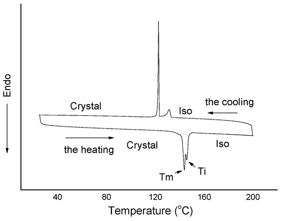 A POM with a heating stage and DSC were used for measuring the melting temperature (Tm) and isotropization temperature (Ti) of the compound (Figure 4 and Figure 5). The peak temperatures obtained in DSC traces were found to be in accordance with POM observations except for the heating scan (Figure 5). They underwent crystal-to-isotropic transitions in heating scan without showing any liquid crystal property. However, POM showed a time of liquid crystal phase (Figure 4b). Therefore, it was speculated that the temperature between Tm and Ti was very close. The DSC thermogram showed that these two peaks partially overlapped.