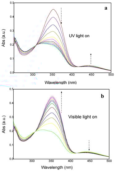 Under alternating UV and visible light irradiation, azobenzene compounds can reversible photoresponsive between the trans and cis forms. The UV/Vis spectroscopic test of the C4-Azo-C5-HDA was performed to investigate the light-responsive behavior. Figure 6 shows a broad absorption around 350 nm mainly due to the transformation of the azobenzene group. When the UV light was on, the trans-cis isomerization indicated by the decay of the maximum absorption band was at around 350 nm and the generation of a new absorption was at 446 nm (Figure 6a). When the visible light was switched on, the profiles of the peaks increased, which shows that this photo-induced isomerization is reversible (Figure 6b) [26].