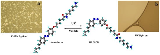 For these smart response systems, the structure conversion is carried out through the photochemical process of the photochromic unit. Azobenzene has been successfully introduced into gelators for reversible trans-cis photochemical isomerization upon exposure to different wavelengths of light, resulting in changes in the self-assembly structure [7,8,9,10,11,12]. Smart liquid crystal has developed rapidly in recent years [13,14,15]. The liquid crystal containing azobenzene attracts much attention due to the combined properties of liquid crystallinity, photoresponsivity and reactivity. These make them promising in designing intelligent photo-driven soft materials [16]. Peng designed and studied a novel azobenzene compound, which can be assembled into highly ordered and viscous lyotropic liquid crystal (LLC) phases at a certain water content [17]. Azobenzene is a hydrophobic group, which means it is not easily introduced into water. In addition to its solubility, its ability to self-assemble into a three-dimensional structure should also be carefully considered [18]. Thus, designing and implementing multiple responses in liquid crystals is of significance not only for scientific research, but also for potential applications.