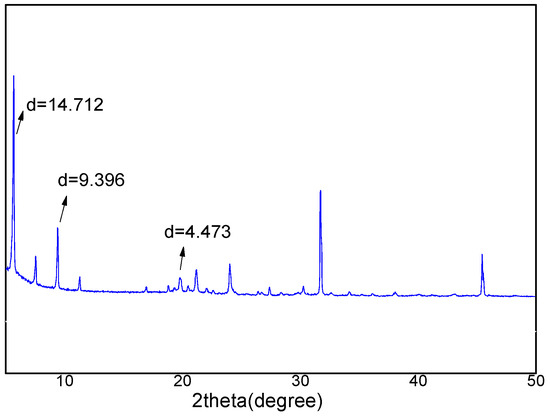 C4-Azo-C5-HDA can promote aggregation of the gelator into the high-order assemblies for gelation. XRD spectra were used to investigate the molecular packing and orientation structure of the gel fiber detail. Figure 9 gave a peak at 2θ = 19.8 (d spacing = 4.473 Å) and a peak at 2θ = 9.5 (d spacing 9.396 Å), accompanied by another peak at 2θ = 5.9 (d spacing 14.712 Å). C4-Azo-C5-HDA exhibits complete self-assembly behavior. As shown in Figure 9, three scattering peaks with the ratios of 1:2:3 in the d spacing were observed, demonstrating the presence of a long-range, ordered lamellar structure. This is probably because the hydrophobic domains’ phase is separate from the hydrophilic units, and this nanophase separation process promotes the bilayer packing of the molecules.
