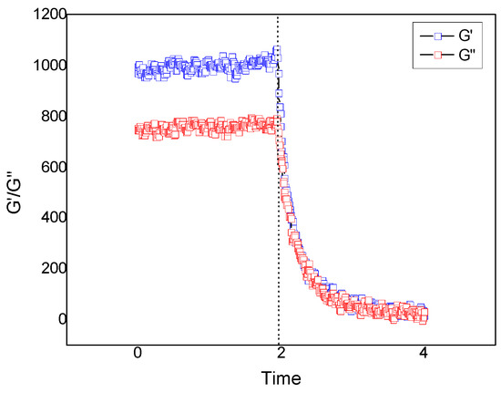 Real-time photo-rheology measurements (2.0 wt%). The data were obtained at a constant frequency of 5 rad/s and a strain of 1.0%. UV turned on at 2 min.