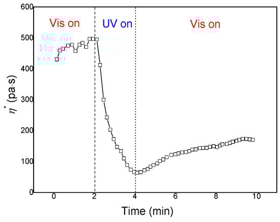 Dynamic changes in rheological properties of materials upon exposure to light can be readily measured using photorheology. As shown in Figure 10, the dynamic changes of the storage modulus(G’) and loss modulus (G”), with time were clearly observed under UV light exposure. In the beginning, the G’ was greater than the G”. During exposure of the gel to UV light, a dramatic decrease of moduli was observed and a new plateau values were reached within 2 min. A corresponding change in viscosity was also observed (Figure 11). The initial highly viscous gel changed to a low-viscosity fluid under UV irradiation within 2 min. After the UV exposure, the UV light was turned off. At the same time, visible light was turned on. The reversibility of the system was demonstrated by the recovery of the rheological properties upon exposure of visible light. However, the rate of recovery was relatively slow comparing to exposure with UV light. For the solution to completely return to the initial state took more than 12 h.