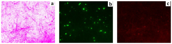 Human fibroblasts L929-supportive properties of the C4-Azo-C5-HDA hydrogels. After hydrogel swelling in culture medium for 24 h, L929 were seeded onto the hydrogels and incubated for 24 h: (a) bright field, (b) live cells on the hydrogel and (c) dead cells on the hydrogel.