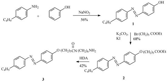 The following are available online at https://www.mdpi.com/article/10.3390/cryst11121560/s1, Figure S1: 1H NMR spectrum of compound 1 in CDCl3, Figure S2: 1H NMR spectrum of compound 2 in CDCl3, Figure S3: 1H NMR spectrum of C4-Azo-C5-HDA in CH3OH-d4, Figure S4: FTIR spectrums of compound 1, compound 2 and C4-Azo-C5-HDA.