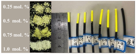 Figure 1 shows the dosimeter of fluorescent powder as a coating material applied around the transmission fiber as a sensing center, encapsulated in a YAG: Ce powder dosimeter with a diameter of about 1.5 mm. The left side of the physical picture corresponds to the sol-gel method’s different doping concentration samples; doping concentration increases from top to bottom.