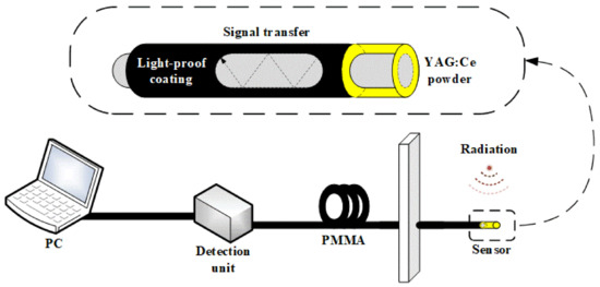 The schematic diagram of the sensing experimental setup; inside the dashed line box, the composition of the dosimeter is shown, where the yellow part represents the YAG: Ce powder and the gray part refers to the PMMA fiber.