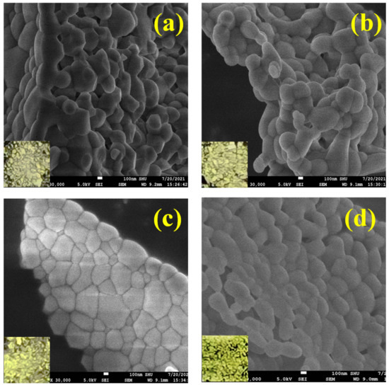 SEM patterns of samples with four coping concentrations with magnification ×30,000. (a) 0.25 mol.% Ce doping (b) 0.5 mol.% Ce doping (c) 0.75 mol.% Ce doping (d) 1 mol.% Ce doping. Corresponding physical map in the lower-left corner.