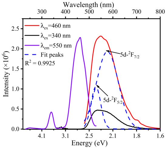 Under the emission monitoring wavelength of 550 nm (2.25 eV), the excitation spectrum of YAG: Ce powders produced two main excitation bands at 340 nm (3.65 eV) and 460 nm (2.7 eV), respectively, shown in Figure 5. Gauss decomposition of the emission peaks at 460 nm produced two fitted peaks: 515 nm (2.41 eV) and 580 nm (2.14 eV), with an energy difference of 0.27 eV. The luminescence of the Ce3+ was due to the excited state of 5d transition to the ground state of 4f; the Ce3+ replaces the position of Y3+ in the YAG crystal, and under the action of the crystal field, the 4f ground state splits into two free ion states, namely, 2F7/2 and 2F5/2. Research has shown that in different substrates, the energy levels formed by the coupling of the spin orbit are different, and the energy difference is about 0.25 to 0.31 eV [35]. The energy difference between the two fitted peaks in Figure 5 is 0.27 eV, which is consistent with the results in the literature, so it can be determined that the luminescence of the two energy gaps corresponds to the transition of Ce3+ from 5d to 2F7/2 and 2F5/2, and it therefore produced two main excitation bands at 340 nm and 460 nm.