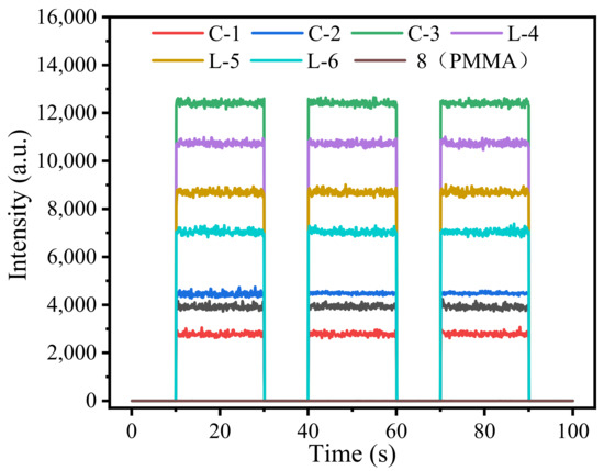 For certain radiation sources, the parameters for radiation measurement are mainly the dose and dose rate, and whether these two parameters can be measured correctly and repeatable becomes the criteria of radiation dosimeter. The first thing to identify is whether the dosimeter is repeatable; we studied the RL response of the seven dosimeters prepared in Section 2.2; the parameters are listed in Table 1. We set the X-ray energy at 60 kV with dose rates of 2.025 Gy/min, and an irradiation time of 20 s per exposure, carried out several repeated experiments with seven dosimeters, and intercepted the RL response three times, as shown in Figure 9. Figure 9 shows that under the same irradiation conditions, the response of the RL signal produced by each dosimeter of repeat tests is basically level, indicating that the dosimeter prepared by coating YAG: Ce powder on PMMA can completely carry out radiation detection; with the sensitive monitoring unit, a rather flat waveform during irradiation was obtained. It was found that the C-3 response is much higher than that for other dosimeters. The dosimeter of C-3 has a relatively high YAG: Ce powder coating concentration, and it therefore has more luminescence centers; thus, a higher light yield is reached. Under the same coating length, C-1, C-2, and C-3 show a gradually increased signal intensity, indicating that the increase in coating concentration could lead to a higher luminous efficiency to a certain extent, whereas C-1, L-4, L-5, and L-6 have a fixed coating concentration and gradually increased the coating length. However, the response rose and then decreased, indicating that saturation was reached. Further increasing the length of the dosimeter will only result in a greater loss.