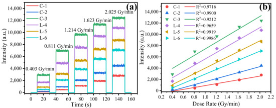The RL response of the dosimeter at differently irradiated dose rates of 0.403 Gy/min, 0.811 Gy/min, 1.214 Gy/min, 1.623 Gy/min, and 2.025 Gy/min was studied under the same test conditions. RL responses for six dosimeters are shown in Figure 10a. As can be seen from the figure, the signal intensity comparison of dosimeters at each radiation dose rate is consistent with the results of repetitive measurements, and when the given dose rate is altered from low to high, the real time RL response of all dosimeters increases. The mean value of RL response under certain dose rates was taken as the RL response at that dose rate, and the relationship between the radiation dose rate and the response of the six dosimeters was linearly regressed in Figure 10b.