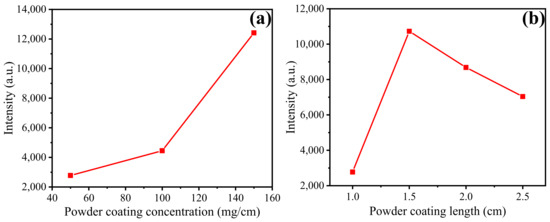 Effect of coating. (a) Comparison between coating concentration and signal intensity; (b) comparison between coating length and signal intensity.