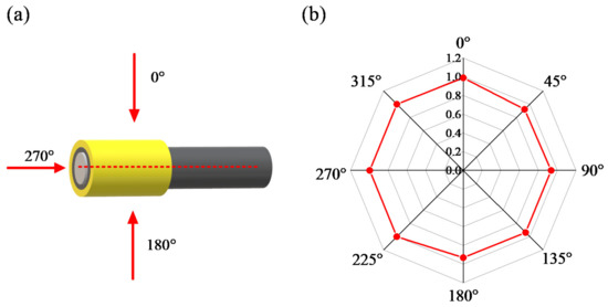 Radial-angle-dependence response of dosimeter. (a) schematic diagram; (b) radar chart of radial-angle dependence.