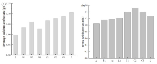 According to the composition of the nutrient solution, the content of calcium carbonate produced is added to the beaker with bacterial liquid and various nutrient solutions as shown in Figure 2a. Among the four types of nutrient solutions (A, B, C, and D), the average calcium carbonate content of the compound nutrient solution of Group D was the highest, and the average calcium carbonate content of the basic nutrient solution of Group A was the lowest. In the Group B test, the average calcium carbonate content only added with ammonium chloride was the highest. In the Group C test, the average calcium carbonate content added with sodium bicarbonate + ammonium chloride was the highest. These findings showed that the compound nutrient solution could effectively promote the production of calcium carbonate. Figure 2b shows that the addition of the nutrient complex increased the urease activity.