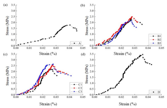 Stress–strain curve of sand solidified with various nutrient solution compositions.Stress-strain of group A (a); Stress-strain of group B (b); Stress-strain of group C (c); Stress-strain of group D (d).