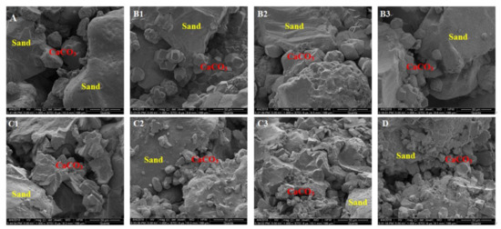 SEM images of sand solidified with various nutrient solution compositions. SEM image of group A (A); SEM image of group B1 (B1); SEM image of group B2 (B2); SEM image of group B3 (B3); SEM image of group C1 (C1); SEM image of group C2 (C2); SEM image of group C3 (C3); SEM image of group D (D).