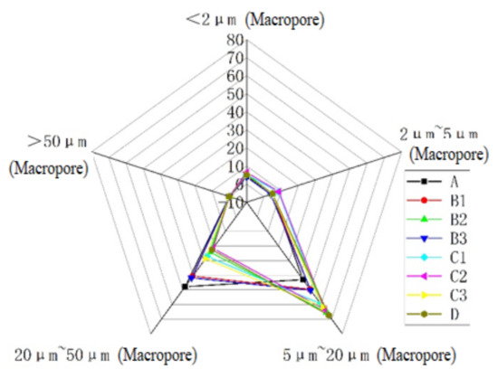The various pore sizes of solidified sands with different nutrient solution components are divided into five categories: hole (>50 μm), macropore (20–50 μm), mesopore (5–20 μm), small pore (2–5 μm), and micropore (<2 μm) [33]. As shown in Table 2 and Figure 7, the microscopic pores of sands solidified with various nutrient solution components have no holes. The proportion of macropores and mesopores is relatively large, and that of small pores and micropores is relatively small. A comparison of the unconfined compressive strength (Figure 4) shows that the curing strength gradually increases, the proportion of mesopores in the sand column gradually increases, and the proportion of macropores gradually decreases from Group A to Group D. As shown in Figure 5, the increase in curing strength may be due to the increase in calcium carbonate content, which caused some large pores to be filled and transformed into mesopores.