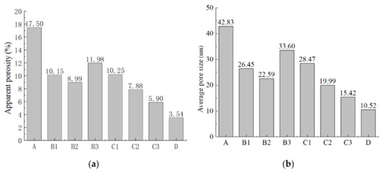 Figure 6 and Figure 8 show that Group A had the highest apparent porosity and average pore size. After 1–3 kinds of sodium bicarbonate, ammonium chloride, and nutrient broth were added, the apparent porosity and average pore diameter of the sand column were reduced, with Group D showing the greatest decrease, followed by Groups C and B. The apparent porosity and average pore size of the sand solidified by the compound nutrient solution added with five components reached 3.54% and 10.52 μm, which were reduced by 79.77% and 75.44% compared with the basic nutrient solution, respectively.