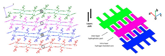 Crystallographic (left) and schematic (right) representation of the layered structure of LLHM, showing layers that shift resulting in plasticity under mechanical stress (adapted from [34,35]). Layers’ shifts are marked with an arrow sign depending on the direction of displacement.