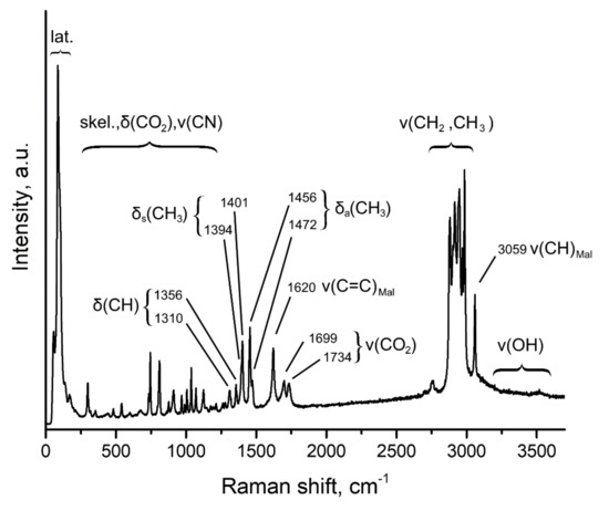 The complicated structure of LLHM significantly constrains precise band assignment in Raman spectra. Nevertheless, literature data and calculated gas-phase vibrational spectra of L-Leucine and maleic acid ions and their dimer helps to assign main band regions of obtained experimental spectra (Figure 3) [60,61,62,63,64,65,66]. All literature data except ref. [67], which contains multiple inaccuracies, confirm the suggested band assignment.