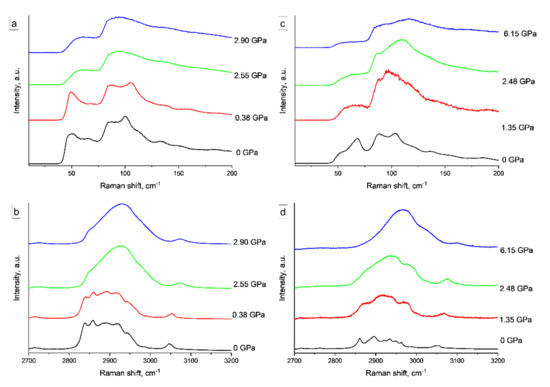 High pressure experiments were provided in different PTMs using DAC as reported in the Section 2. Usage of SCXRD was limited due to the poor diffraction data, which is a result of the nature of the LLHM crystal structure (defining plasticity) and DAC construction. Thus, only Raman spectra were recorded for all high-pressure experiments.