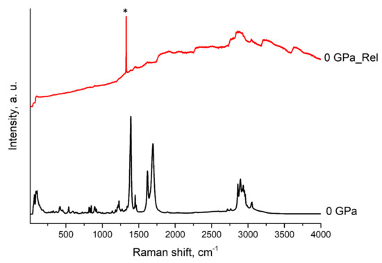 The high-frequency Raman region is not very informative, lacking -OH and -NH3 vibrational modes information at high pressures [73,74]. Nevertheless, some changes in -CHx vibration modes confirm crystal changes in PIP in contrast to paraffin (full Raman spectra at all pressures are shown in Figure S3). We also report spectra of LLHM crystal in PIP at 0 GPa before pressure impact and after relaxation from 6.15 Gpa (Figure 6). Significant background level (halo) may be explained with possible amorphization of plastic LLHM crystal at high pressure or luminescence, which was not observed before pressure impact.
