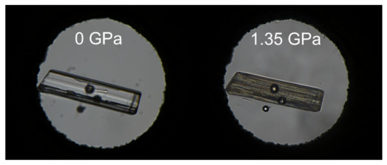 Possible phase transition in PIP was additionally confirmed by optical microscopy, which recorded crystal destruction at 1.35 GPa (Figure 7). No obvious changes of LLHM crystal in paraffin occurred in the whole pressure range according to optical microscopy. This confirms different behavior of LLHM crystals under pressure in different media.