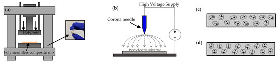 Electrical polarization was required to align the dipoles in a piezo-composite substrate that becomes piezoelectrically active. Fundamentally, there are two major poling methods, namely contact and non-contact techniques. Corona poling, a non-contact technique, presents significant advantages as it eliminates surface damage through electrode contact with the sample, where the occurrence of arcing at very high voltages is less likely and uniform voltage distribution is attainable. In this technique, the electric charge was applied to the corona needle that acted as a field intensifier to ionize the gas molecules around the sample’s top surface (un-electroded surface) to create an electric field [33,34]. Variables influencing the poling efficiencies were the amount of voltage supply, poling time, and distance between the corona tip as well as sample surface [35]. A high voltage of 12 kV–15 kV was applied to the sample that was placed 2~3 cm distance from the needle tip for 30 min. Piezoelectric property measurement was compared before and after poling of the different combinations selected. The schematic of corona poling is shown in Figure 1b.
