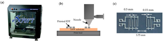 Direct digital manufacturing (DDM) is the process of printing the product directly from the designed CAD model. The design model can be modified on demand by minimizing waste with quick prototyping in cost-effective means with good adhesion of conductive ink and higher sustainability over other traditional cleanroom fabrication process [21]. A 3Dn series tabletop printer, shown in Figure 2a, combining the capabilities of FDM and micro-dispensing with high precision motion, was used to print the designed IDT nScrypt file. An IDT design with 3 input pairs and 2 output pairs had the finger width of 0.15 mm and 0.5 mm spacing between the adjacent fingers placed 3.75 mm apart with 3.5 mm acoustic aperture. A DuPont CB028 conductive silver paste was printed, as shown in Figure 2b, using a nozzle of 125 µm inner diameter, 20 mm/s deposition speed, and ejection pressure of 8 psi, maintained at a printing height of 100 µm from the substrate top surface. Figure 2c shows the conductive IDT pastes printed without discontinuity and coupled appropriately with the piezoelectric substrate.