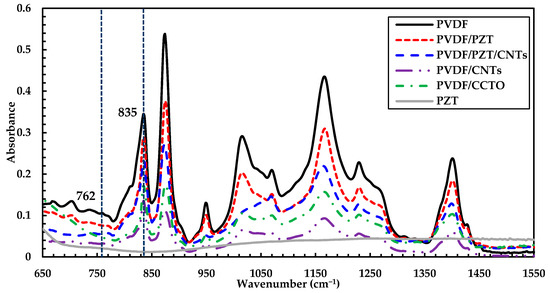 The FTIR spectra of PVDF polymer with added fillers provides information about its crystalline structure, allowing us to distinguish between the different phases. It is already known that the various peaks of phases are classified into three categories, i.e., (1) common peaks that appear in all phases; (2) peaks exclusive for one of the phases; and (3) dual peaks combining different phases. In order to analyze the effect of adding different fillers in PVDF polymer, FTIR spectra are compared for the tested samples, as shown in Figure 3. An Agilent Cary 630 FTIR spectrometer with diamond crystal was operated in the wavenumber of 650–1550 cm−1 with a resolution of 4 cm−1, and 16 scans followed with automatic background correction.