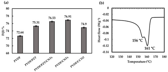 (a) Relative fraction of calculated polar β phase. (b) DSC curve of PVDF sample.