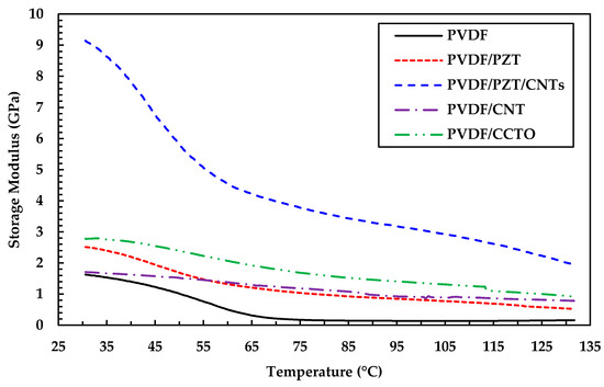 Figure 8 describes the storage modulus (E’) as a function of temperature at a constant frequency of 1 Hz for all the different sample configurations with the tensile fixture. It was observed that the storage modulus of PVDF increased when micro- and nano-fillers were added, which can be attributed to their effectiveness in transferring the interfacial stress and limiting the segmental motion of polymer chains. A maximum modulus of 9.14 GPa was obtained in a sample with two combinations of fillers, such as PZT and CNTs, which resulted in higher energy storage tendency when compared with only PZT, CNT, and CCTO fillers. It is evident that, when the amount of fillers was less, the tendency to restrict the molecular motion of PVDF polymer was limited, where less force was required for deformation, resulting in diminished overall E’ of the material with an increase in temperature.