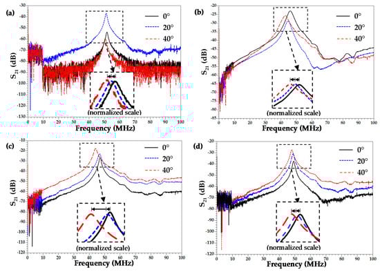Frequency response representation from 10 kHz–100 MHz at different angles: (a) PVDF/PZT; (b) PVDF/PZT/CNTs; (c) PVDF/CNTs; (d) PVDF/CCTO. The zoomed in box shows the peak shift in normalized frequency response when the SAW sensor was under bending in three different angles.