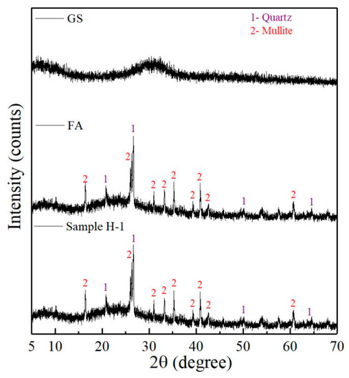 Figure 2 shows the XRD patterns of the FA and GS raw materials. Alongside the XRF results (Table 1) for GS, the XRD pattern shows that GS contains a large number of elements, such as calcium, silicon, and aluminum; however, there is no GS characteristic peak in the XRD pattern, which indicates that GS is predominantly characterized by an amorphous structure. This is attributed to the fact that GS is a glassy substance formed by the melting of silicate and aluminosilicate as the main components when smelting pig iron in a blast furnace, which cannot get crystallized after quenching. Therefore, GS is a raw material with a high polymerization activity.