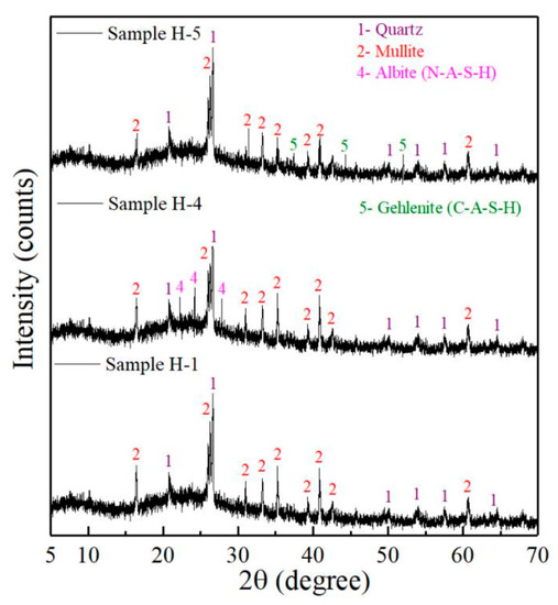 When excited by NH, the characteristic peaks of mullite at 16.5°, 35.3°, and 40.9° in the XRD pattern of sample H-5 were further reduced compared with those of samples H-1 and H-4. This shows that the amounts of active silicon and aluminum participating in polymerization in sample H-5 are significantly higher than those in samples H-1 and H-4, which indicates that NH exhibits a more pronounced excitation effect than other single activators. Moreover, the XRD pattern of sample H-5 clearly shows the characteristic peaks of gehlenite (PDF 35-0755, 16.5°, 35.3°, and 40.9°); this peak was not visible in the patterns of samples H-1 and H-4. The addition of NH significantly improves the pH and creates a highly alkaline excitation environment, which promotes the gradual activation of silicon, aluminum, and a small amount of calcium in FA [19]. Under the action of a high concentration of OH−, active calcium polymerizes with silicon and aluminum to form gehlenite [20], which is the main reason for the reduction in the intensity of the characteristic peaks of mullite as well as the appearance of the gehlenite peak in the XRD pattern of sample H-5.
