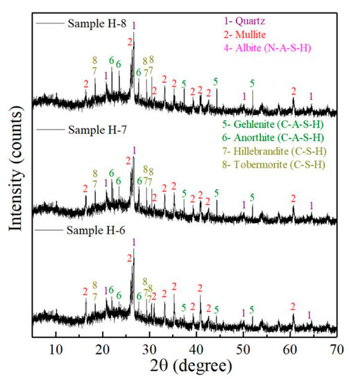 With the increase in the GS content (180 g, 40%), the intensity of the characteristic peaks of the mineral crystals in the XRD pattern of sample H-7 changed significantly compared with those of sample H-6, as shown in Figure 3. The intensities of the characteristic peaks of mullite (16.4°, 31°, 35.2°, and 40.8°) in the XRD pattern of sample H-7 were significantly lower than those of sample H-6. This shows that the amount of FA participating in the polymerization reaction in sample H-7 is significantly increased. Furthermore, it shows that the increase in the GS content can enhance the polymerization activity of FA in a strongly alkaline excitation environment [29]. At the same time, the intensities of the characteristic peaks of gehlenite (16.4°, 31°, 35.2°, and 40.8°) and anorthite (22°, 23.5°, and 27.7°) in the XRD pattern of sample H-7 were significantly higher than those of sample H-6. This indicates that with the increase in the GS content, the contents of active calcium, silicon, and aluminum in the polymerization environment are further increased, which establishes favorable conditions for the formation of gehlenite and anorthite. The increase in the GS content promotes the FA activity, favors the decomposition of mullite in a highly alkaline environment, gives rise to the formation of active silicon and aluminum, and gets polymerized with the active calcium provided by GS to form anorthite [30]. Consequently, as the GS content increased, the intensities of the characteristic peaks of mullite in the XRD pattern of sample H-7 decreased significantly, while the intensities of the characteristic peaks of gehlenite and anorthite increased significantly. Furthermore, the intensities of the characteristic peaks of tobermorite and hillebrandite (18.4°, 29.4°, and 30.4°) in the XRD pattern of sample H-7 were significantly higher than those of sample H-6. This shows that in a highly alkaline reaction environment, as the GS content increases, the crystallinity of the tobermorite and hillebrandite crystals is tremendously improved, which indicates the formation of a larger amount of calcium silicate gel (C-S-H) [31]. Therefore, the increase in the GS content promotes the formation of hydrated calcium silicate and hydrated calcium silicoaluminate, which leads to dramatic improvement in the compressive strength of sample H-7 (23.7 MPa, 28 d, 88.1% higher than that of sample H-6).