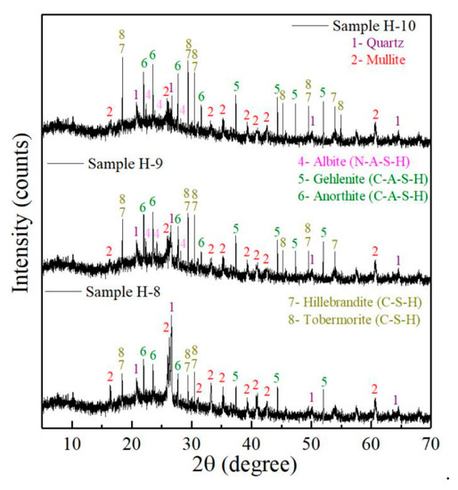 When a certain amount of CH (45 g) was added, the compressive strength of sample H-10 increased to 36.8, 52.3, and 58.4 MPa (Figure 1), being 28.2% (after being cured for 3 d), 30.1% (after being cured for 28 d), and 28.9% (after being cured for 60 d) higher than that of sample H-9 (without CH addition). Thus, the addition of CH can also significantly improve the compressive strength of FA polymer samples; however, this can only occur when sufficiently large amounts of NH, GS, and LSS are added. CH is mainly composed of calcium ions. When dissolved in a polymerization environment, CH can provide a large amount of active calcium, which can combine with the active silicon provided by LSS to form hydrated calcium silicate gel [15], thereby significantly improving the compressive strength of sample H-10, as confirmed by the XRD results.