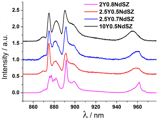 Figure 2 shows the 4F3/2 → 4I9/2 transition luminescence spectra of Nd3+ ions for Nd3+ ion 4F5/2 level excitation at T = 77 K for the 2Y0.8NdSZ, 2.5Y0.5NdSZ and 2.5Y0.7NdSZ concentration range of the crystals. The luminescence spectrum of the cubic 10Y0.5NdSZ single crystal is shown for comparison.
