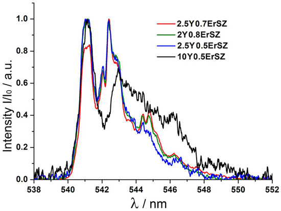 The absorption spectra of the 2Y0.8ErSZ, 2.5Y0.5ErSZ and 2.5Y0.7ErSZ crystals corresponding to the transition from the main 4I15/2 multiplet to the excited 4S3/2 multiplet at T = 77 K are shown in Figure 3.