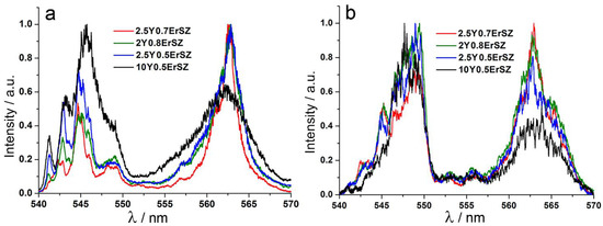4S3/2 → 4I15/2 transition luminescence spectra of Er3+ ions for selective excitation to the 4F7/2 level at T = 77 KL (a) λex = 440 nm and (b) λex = 445 nm.