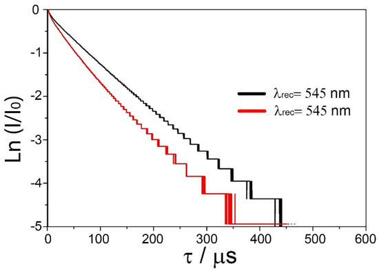 The fact that the bands in the 540–545 nm and 546–550 nm regions correspond to Er3+ optical centers with different local neighborhood symmetry is further supported by the results of luminescence extinction kinetics analysis for the 4S3/2 level of Er3+ ions in the 2.5Y0.5ErSZ crystal as shown in Figure 5. The luminescence extinction curves were recorded at λrec = 545 nm and λrec = 549 nm at excitation by the second harmonic of a λ = 532 nm YAG:Nd laser.